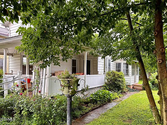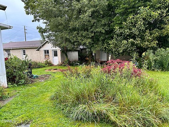Features include a covered front porch and an enclosed sunroom. The property also boasts several outbuildings, including a two-car garage and two additional block outbuildings, providing ample storage or workshop spaces.