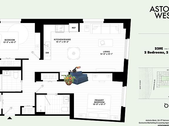 Welcome to Astoria West. Uniquely positioned on the Astoria, Queens beachfront is Astoria West: 534 residences designed by the award-winning architecture firm Fogarty Finger just one and a half blocks from the NYC East River Ferry dock, and only minutes from Midtown Manhattan. Astoria West consists of luxurious studio, one-, two- and three-bedroom homes that enjoy scenic views of the East River, charming Astoria row houses, the iconic Long Island City and Manhattan skylines, as well as tranquil views of the building's very own private courtyard garden.