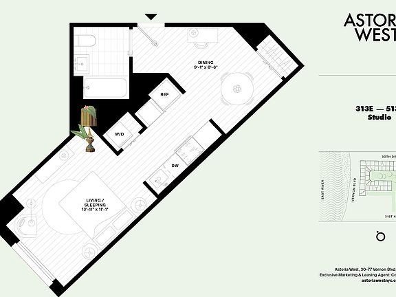 Welcome to Astoria West. Uniquely positioned on the Astoria, Queens beachfront is Astoria West: 534 residences designed by the award-winning architecture firm Fogarty Finger just one and a half blocks from the NYC East River Ferry dock, and only minutes from Midtown Manhattan. Astoria West consists of luxurious studio, one-, two- and three-bedroom homes that enjoy scenic views of the East River, charming Astoria row houses, the iconic Long Island City and Manhattan skylines, as well as tranquil views of the building's very own private courtyard garden.
