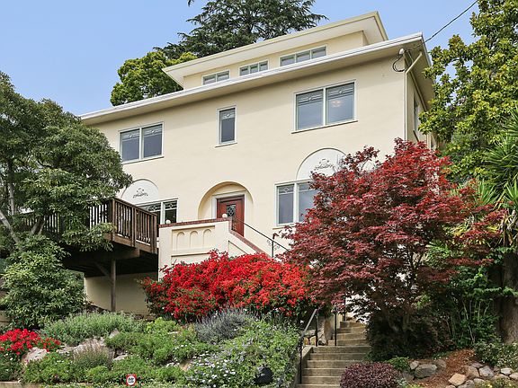 Unforgettable panoramic bay views capture your attention in this rare Claremont Hills home. Your craving for an active lifestyle are rewarded with daily adventures in your own backyard garden encompassing four distinct terraces rising up the hillside, most with bay views. The penthouse suite offers commanding views for dreaming plus built-in desk and window seat. Two front bedrooms, one en suite, offer bay views; the fourth bedroom overlooks the dramatic terraces. French doors in the office/guest room invite you to a rear deck and terraces. Interior design by Lauren Nelson Design. Dozens of thoughtful upgrades include the stylish chef's kitchen, breakfast bar plus window seat. Engineering investments include a retracting living room theater, helical foundation piers, 50-year solar-ready roof, HEPA furnace, and deer fences. Civilization is conveniently close at the Claremont Club and Spa, and Claremont Ave coffee, restaurants, AC Bus E to SF, BART.