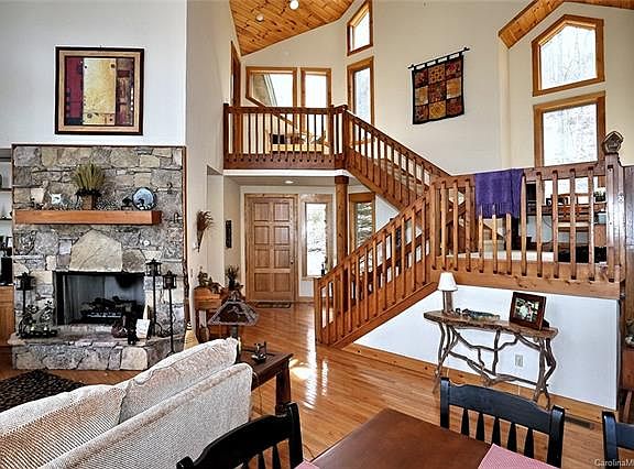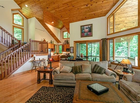 This custom home at Mountain Air Country Club is located on the 17th fairway of the golf course. With an open floor plan, vaulted ceilings and ample windows for amazing views, it's the perfect mountain home to enjoy with family and friends. The main floor offers an open kitchen, dining and living area under soaring pine ceilings, beautiful hardwood floors, stone fireplace with built-ins, separate laundry room, and powder room. Private Master suite with a generous ensuite bath on the top floor features another fireplace and access to the secluded top deck with great views. Lower level offers 2 guest rooms and bathrooms, gathering area\office or study and a large unfinished space perfect for storage and or workshop. Enjoy both long-range mountain and golf course views from the spacious decks on all three levels of this amazing single-family home. Two-car garage with entry to the main level. Close to all amenities and activities at Mountain Air.
