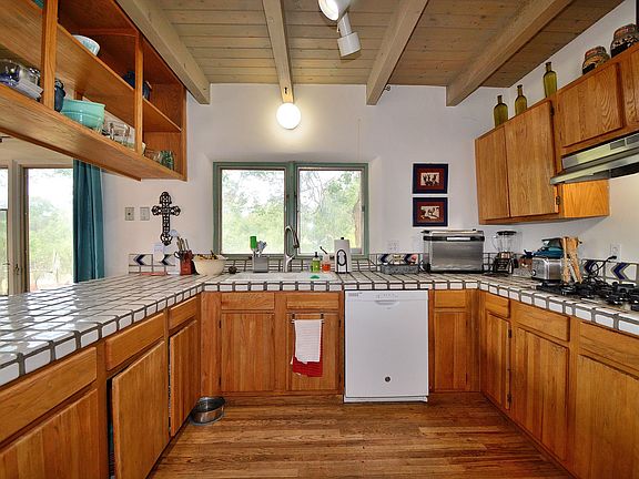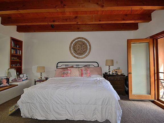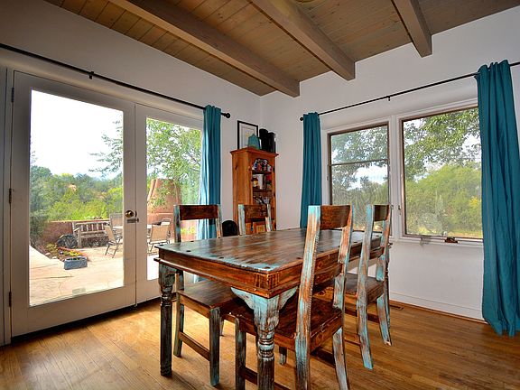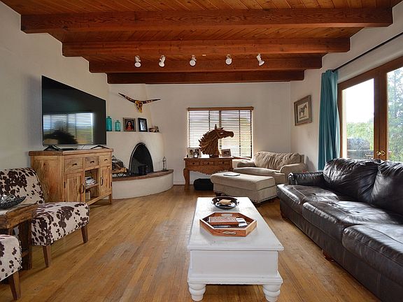 This exceptional property features a two-bedroom design, complete with a fireplace in the living area and an outdoor patio that lends itself to serene outdoor living. It is privately situated in Tesuque, conveniently located just down the street from Tesuque Market. The property includes a coral suitable for horses, utilizing a well for a water supply. The residence is styled in an older ranch house manner, showcasing a blend of tile and carpet flooring within an open concept layout. The master bedroom is located on the upper level and includes an en-suite bathroom, offering views of the surrounding area. Additionally, this room is equipped with a wood stove. The downstairs bedroom also includes a bathroom with a standing shower. A large den is available, providing the flexibility to serve as an additional bedroom, office, or studio for artistic endeavors. This property is accessed through a gated entrance. Home is on a well.