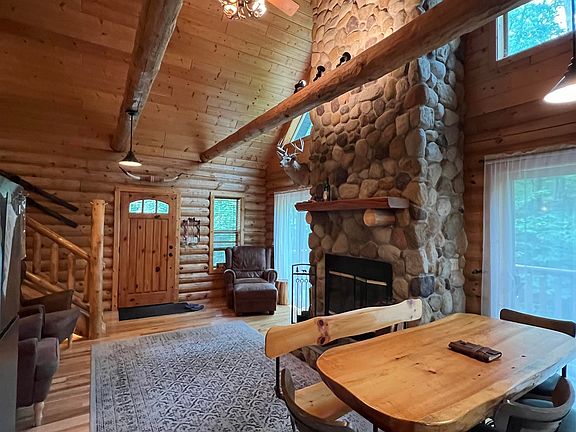 Picturesque log home with floor to ceiling stone fireplace create the perfect ambiance of true mountain living! Cathedral ceilings with exposed beams, open kitchen-living space, loft bedroom with 3/4 bath, and 2 main floor bedrooms are just a few of the many "must-have" features of this well crafted home. The kitchen is well appointed with stainless steel appliances and gorgeouse black granite countertops. Head downstairs to the family room with wood stove and sliders to the back yard and fire pit area. Mix up a few drinks behind your full basement bar that will make all of your friends jealous! The lower level also has an extra sleeping room and a 3/4 bath. Plenty of room to entertain in this great getaway. Beautiful covered porch, large back deck, and HEATED DRIVEWAY roundout the list of all the extras this home boasts. Onlya 5 min walk to your neighborhood beach on the Saco River, 6 minutes to Storyland, 5 minutes to Attitash Mountain ski resort, 15 minutes to North Conway Village and Cranmore Mountain.