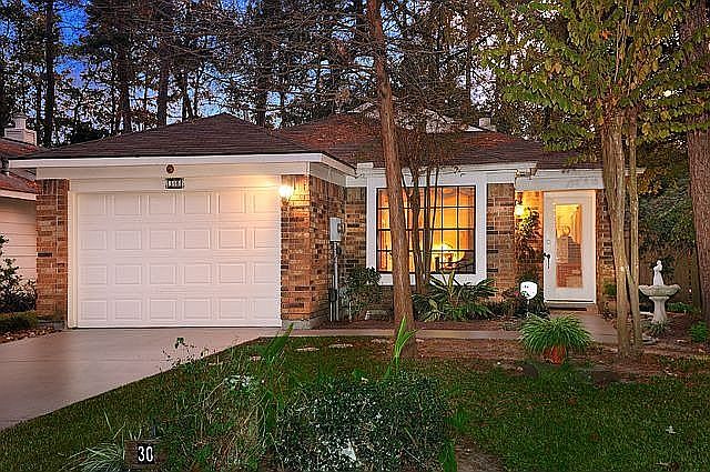 Charming one story Ryland patio home shown plenty of TLC in Cochran's Crossing! What a great location in the heart of The Woodlands-close to everything! High ceilings, carpet & tile floors, updated kitchen & den w/wood burning fireplace, formal dining, spacious master. Fenced yard has gorgeous deck, hot tub & barbecue area surrounded by well-tended landscaping. Oversized garage too. Storage shed stays!