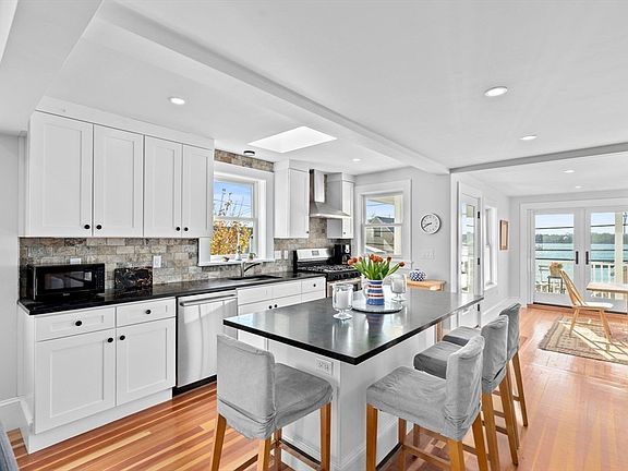 Welcome to this sunny, tastefully renovated & decorated 3 bedroom home just steps to Nantasket beach, restaurants and shopping. This beautiful home with amazing water views, has many updates including 3 updated bathrooms, new kitchen island, cabinets, counter tops and appliances, updated plumbing, updated electrical, raised ceiling in living room with skylights, blown in insulation, new decks and railings, new grading in the yard with new stone walls, new furnace, several windows replaced, new gutters and downspouts. This sunny and bright home has too many updates to list. This can be your year around home or a great 2nd home for fun summers and holidays. Finished lower level could make a great in law or guest suite. All floors have an outdoor access with water views. 2 Patio areas, off street parking and garage/storage space. Convenient location with easy access in and out of Hull.