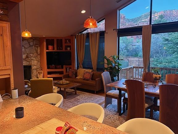 Tucked quietly into the Village of Oak Creek, this single-level jewel box is the definition of happy design, where vibrant style meets rare privacy and views that set the horizon on fire at sunset. The home's great room frames the red rocks through expansive windows, anchored by a stone fireplace that feels as warm as it looks. The kitchen features unique slate floors with an iridescent glaze and opens to a cozy whiskey room; yes, there's one of those, ideal for late night conversation or quiet reflection. Three bedrooms plus a den offer flexibility, while the 2-car garage (half currently outfitted as a salon with its own mini-split system) adds creative options for work or play. Recent upgrades totaling over $55,000 include: fresh interior paint, new hardwood flooring, extended and enclosed decks, enhanced landscaping, and mechanical improvements for year-round comfort. A new roof (2023) and exterior paint, including deck (2022) mean the heavy lifting is already done. Outdoors, curated desert landscaping surrounds open and private decks designed for entertaining, morning coffee, or watching the red rocks glow at day's end. All on one level. All move-in ready. All under $1M. You can't make this up. Moments from hiking, biking, golf, and Sedona's best dining and gourmet grocery. 30 Box Canyon Drive is proof that joy lives in the details.