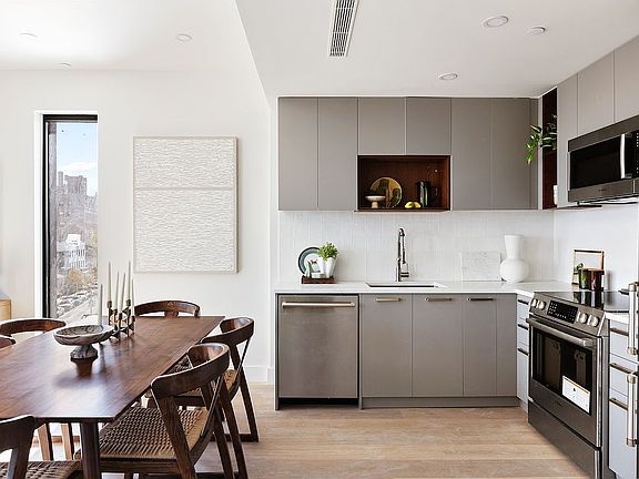 Residence 5C's 2 bedroom, 2 bathroom layout exemplifies the pinnacle of luxury living. The interiors are adorned with rich white oak engineered wood floors, creating a warm and inviting atmosphere. The spacious and open floor plan allows for effortless entertaining and comfortable living leading out to a private balcony overlooking Bushwick Avenue and beyond. The state-of-the-art kitchen is a chef's dream, featuring sleek white countertops and a blend of custom painted wood shaker cabinetry and elegant open shelving that enhance the clean, modern aesthetic. High-end appliances by Bosch ensure every meal is prepared to perfection.