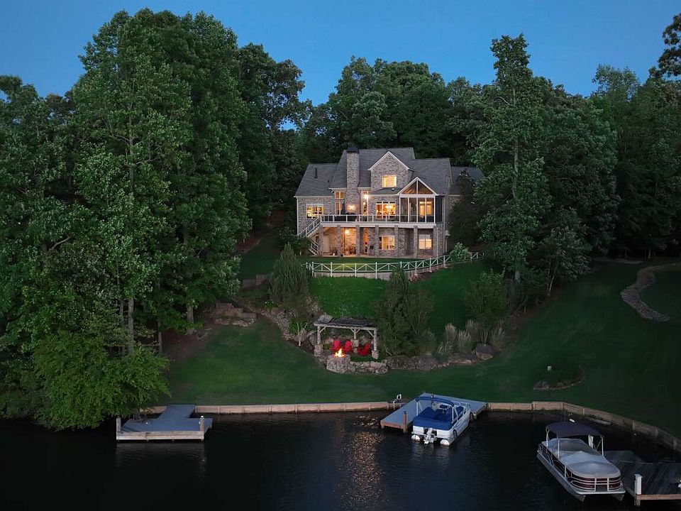 Welcome to our stunning lake-front retreat nestled in a serene Cul-de-Sac setting. This custom-built home features professional landscaping, a private dock, and a custom fire pit, creating the perfect ambiance for lakeside living. Boasting 6 bedrooms and 5 full bathrooms, this traditional European-style residence offers refined living spaces. The heart of the home is the custom kitchen, complemented by custom cabinetry throughout. The main level features a grand great room with a soaring 16-foot coffered ceiling and a magnificent stone fireplace, ideal for cozy gatherings. Entertain guests in the formal dining room or utilize the study/additional bedroom for added versatility. Hardwood floors adorn the main level, including the primary bedroom, offering breathtaking lake views. Descend to the expansive daylight basement, where 12-foot ceilings create a spacious atmosphere. Here, you'll find a mother-in-law suite, kitchenette, and a wired 5-speaker surround sound system, perfect for movie nights or hosting guests. Step outside to the large screened-in porch on the main level and immerse yourself in the tranquil surroundings. Listen to the soothing sounds of geese, swans, and ducks while enjoying the secluded stone terraced backyard overlooking a favorite fishing spot on Lake Redwine. Completing this exceptional property is a 4-car garage and irrigation system utilizing lake water, reducing cost and increasing sustainability. Experience lakeside luxury living at its finest - schedule your tour today!