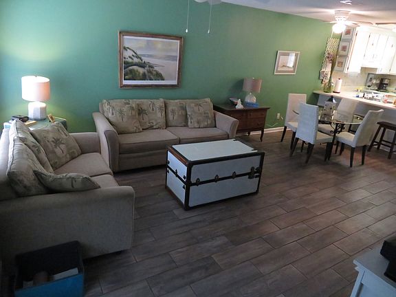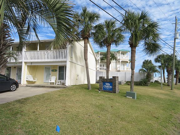 Rarely available! This Villa Chateau townhome has everything you'll want: great location, nicely renovated and the lowest HOA around. It is located in a complex directly across the street from the beach with a beach access in front of the complex. Plus it is just a couple of miles from Pier Park. The unit is very nice and comes fully furnished and ready to enjoy. New flooring was just installed and granite countertops are on order to be installed mid February. Downstairs is the living area with a full bathroom and even a sleeping area under the stairs. Upstairs are 2 bedrooms, each with their own balcony. One even has a ''peek a boo'' of the gulf. There is a bathroom upstairs as well. The HOA fees are $650 paid every 6 months. The complex has a pool and shuffleboard.