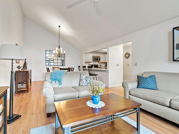 This immaculate condo is located in Chilmark, a 16 acre community with 36 established units, a pool, and lots of green space. Surrounded by woodlands you'll feel miles away, yet you are still close to downtown and all that Falmouth has to offer. Enter through the private, gated courtyard and you will get a sense of the relaxed lifestyle to come. Inside you will find shining oak floors and soaring ceilings & skylights in the entry way with the 1st floor laundry closet in the hall. The kitchen features all stainless appliances, a breakfast bar and lots of cabinet/counter space. The large living/ dining area with a cathedral ceiling, corner fireplace and two beautiful windows that let in lots of natural light is perfect for relaxing by a fire or entertaining guests. The primary suite includes two closets, a full bath with a lg custom shower and a slider to a small private balcony. Bedroom 2 has oak floors and two closets. A beautiful and open oak stairway leads to the lower level and lots of additional finished space, w/ a half bath, TV room, office, and a workout/craft room and enough storage space for all your summer gear. Come check out the easy living at Chilmark!