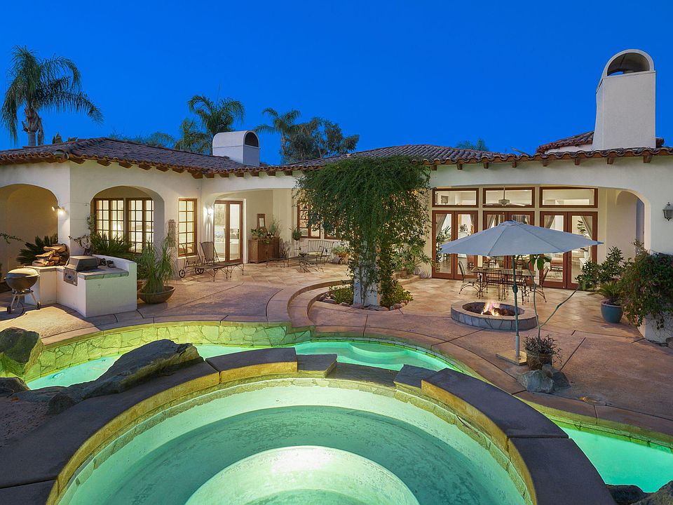 Within the coveted private community of Clancy Lane Estates, your private oasis awaits! Enter through wrought iron gates to a picturesque courtyard that leads you into the home's impressive entry, where you're met with soaring ceilings and an old-world, romantic Spanish / Mediterranean charm. Off the entry is a sunken great room with oversized fireplace and lovely views of the expansive yard and pool. The chef's kitchen features an island with seating, two copper sinks, granite countertops, gas cooktop, double ovens, pantry, and separate office area. The formal dining room boasts beautiful custom built-ins and outdoor access. A separate den is the perfect place to relax and unwind. The open master retreat with pool access and a large en-suite bathroom with separate tub, walk-in shower, dual vanities and walk-in closet. Each of the 4 guest rooms offer their own well-appointed en-suite baths. Entertain outside on the covered patio with fire feature and cool off in the sparkling pool with waterfall and raised spa. Other highlights: two separate outdoor areas- front and back, powder room for guests, additional private office, separate laundry room, 3-car garage, exterior pool bathroom.
