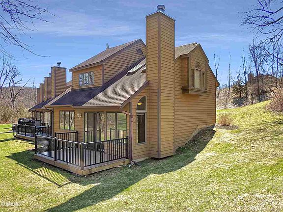 Location, location, location!! Nicely appointed end-unit Creekwood Golf Villa offering a private setting and absolutely incredible seasonal views of Eagle Ridge South Golf Course #11 green, adjoining pond, portions of the signature 18th hole and beyond! Open main level offers living area with vaulted ceiling, vinyl plank flooring, wood-burning fireplace and two skylights, integrated dining area, galley kitchen with stainless appliances, large bedroom, and full bath with direct access from bedroom or main living area. Upper level houses loft space with window seat, spacious master bedroom with more vaulted ceilings and adjoining full bath with skylight and more vinyl plank. Rear deck has been recently updated to composite surface (2020) and is a great place to relax, take in the outdoors and beautiful golf course setting! Covered front porch area also updated to composite in 2020.