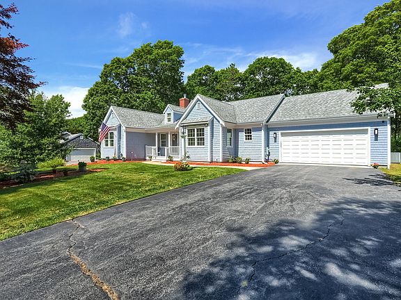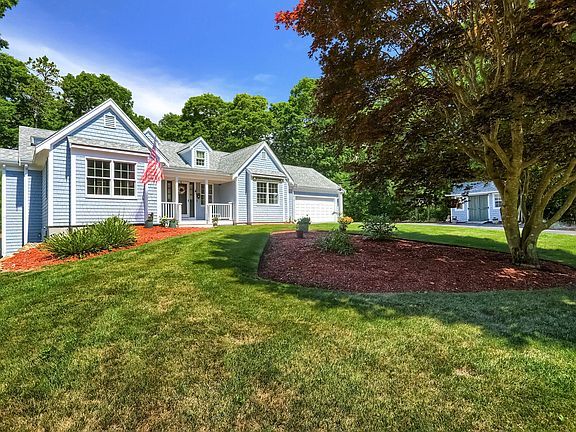 This thoroughly modern Ranch style home shows like new! Located in the heart of North Falmouth on a dead end street, yet just a block to the bike path, restaurants and only a two minute drive to Old Silver or Megansett Beach. The home features the primary suite with updated private bath including the tiled shower, the gorgeous kitchen with quartz countertops, custom cabinets with under cabinet lighting, all with high end fixtures and state of the art appliances, and the formal dining room and separate breakfast room off the kitchen. The living room features soaring cathedral ceilings, dormer windows facing south bringing in streams of light, the gas fireplace, builtin cabinets and french doors leading out to the sun porch. Other fabulous features in the home include the hardwood floors throughout, central AC, the oversized 2 car garage, skylights and the expansive deck. This is the perfect setting for those evening cocktails while admiring the lovely private back yard with room for a pool! Or you can work out in your spotless walkout basement. This home has been well maintained and updated throughout the years and shows Pride of Ownership!! Welcome to your North Falmouth oasis!