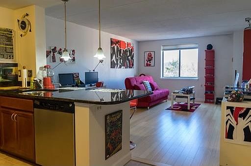 Top floor corner one bedroom condo at The Residences of Stone Gables. Bright and spacious, this unit features bamboo flooring, an open floor plan, updated kitchen with granite counters and stainless steel appliances, large bedroom with walk-in closet, updated bathroom showcasing white subway tile, in-unit laundry, and is decorated with low VOC paint. This unit has two parking spaces, #142 and #2. Building amenities include an inground pool, gym, common laundry, and guest parking.