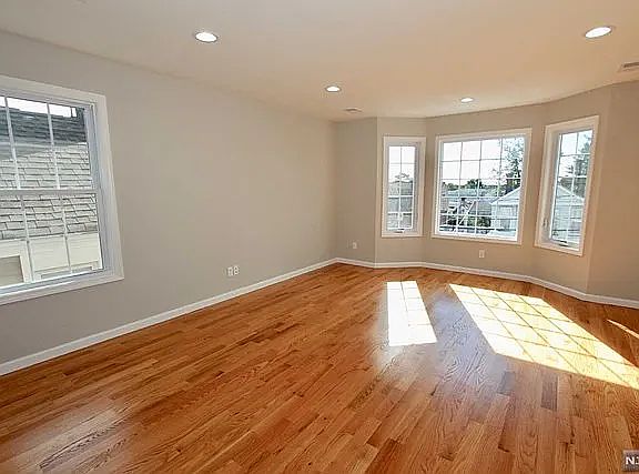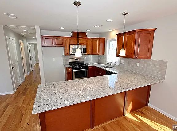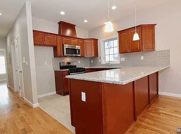 Experience the charm of this stunning two-story apartment that is bound to capture attention! Situated on the first floor, this home features two bedrooms, including a master suite with a convenient walk-in closet and an en-suite bathroom, complemented by a full bathroom for guests. Elegant hardwood flooring enhances the living areas, while the spacious kitchen, equipped with granite countertops and stainless-steel appliances including a refrigerator, flows effortlessly into the dining room. The ground level also offers an additional bedroom, a full bath, and a recreational room with its own entrance, expanding the living space. With one outdoor parking spot and a full garage, this prime location near a park and all your essentials within walking distance, including easy access to public transportation just a 15-minute walk to the PATH station.