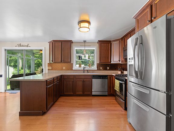 INCREDIBLE OPPORTUNITY! This sprawling raised ranch is everything you have been looking for AND it includes a separate au-pair suite! Drenched in natural light the living room is a great formal entertaining space. Eat-in kitchen with spacious dining area has a breakfast bar, stainless steel appliances, gorgeous cabinetry and plenty of counter space to enjoy a quick breakfast or morning coffee. Three ample sized bedrooms on the main floor as well as a large full bath. Finished basement is a the perfect space for when friends and family come over featuring a family room, full bar area, playroom and home office! Beautiful heated sunroom opens down to the large deck and pool area just in time for you to enjoy before the cool weather hits! 13-zone Irrigation system. Extended living space is available above the 2-car garage feat. a separate side entry, 2 beds, 1 bath, LR and a galley style kitchen.