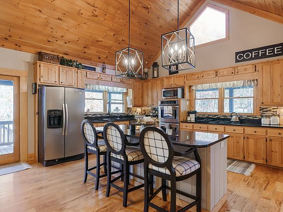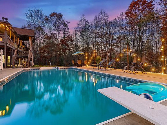 This modern rustic cabin offers an abundance of space & luxurious amenities that will exceed your expectations. Stepping into the enormous great room, you'll be greeted by soaring cathedral ceilings & a captivating kitchen overlooking the living room. But the real showstopper is the beautiful large stone fireplace, adding a touch of warmth & grandeur to the entire space. With 4 bar's and 3.5 ba's on the main level, you'll never have to leave the comfort & convenience of the first floor. But if you're in need of more room, the upstairs loft bedroom offers a private sanctuary. And the terrace level takes it a step further, featuring a spacious viewing room with yet another fireplace, a generously sized br, and another full ba. The outdoor living space of this home is simply unparalleled. Unwind on the full wrap-around porch or by the outdoor fireplace & bar area overlooking the 18x36 pool! Indulge in a refreshing beverage while basking in the sun, or retreat to the pool house, a charming space perfect for changing or storing your favorite poolside treats or toys. In addition to the luxurious features, convenience is taken care of as well. Enjoy the ease of a circular driveway & a drive-under garage, ensuring ample parking space for you & your guests. Plus, the perimeter is fenced in, providing a safe and secure environment for your pets to roam free!