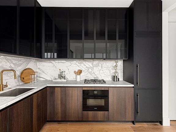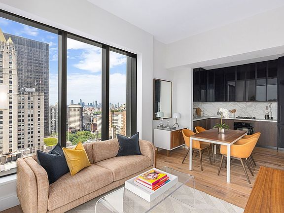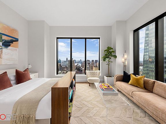 Residence 36D is a 601 SF alcove studio, one bath with southeast and southwest exposures overlooking iconic architecture. Interiors boast rusticated hardwood floors, bronze-finished hardware, and soaring ceilings of up to 11 feet high with window heights of nine feet. The open kitchen with Miele appliances features custom ultra-matte dark charcoal and walnut cabinetry, metal-framed glass upper cabinetry, and Calacatta honed marble countertops. Ample closet space and washer/dryer complete this ideal home, which can be augmented with storage available at additional cost.
