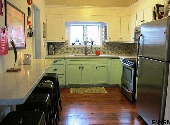 Great older brick home. Wide Plank flooring that has been refinished, original window molding, yet modernized with some up dated windows, Corian countertop, stainless steel appliances, newer furnance, new rubber roof, modern bathrooms. A large garage with an large upstairs which would make a nice studio. A fenced in yard, very large enclosed back porch. FOR MORE INFORMATION, PLEASE SEE THE INFORMATION SHEET UNDER DOCUMENTS