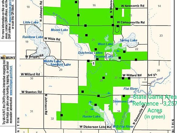 GREAT FIND: WOW,! 'Private- LAKEFRT-1,150 OTA FT: Blacktop Rd Frt 530ft OTA (from county equal-dept records) (Land Contract Considered) hunting/fishing/excell. area nice build sites, Fine Home/Get-Away/Cabin, high ridge dn center land (deer trails will lead you through land) will numerous large hard wood trees overlooking Simmons Lake to west. Opportunity now/in time to come, blacktop rd, just N Greenville/S Lakeview. Just down the road Langston/Flat River/acres state land/sided by acres state land. High ground tapering down some to south end of parcel. Opportunity/Equity Build/ enjoyment for years to come. Most land is hgh and appears to be solid/sandy based, no perc tests have been run, recently. Simmons Lk, nestled in Stanton, MI, is a serene body water known for peaceful surroundings/simple charm. The lake offers tranquil setting, fishing, boating, enjoying the beauty of nature. Surrounded by trees wildlife, Call -7-days wk anytime