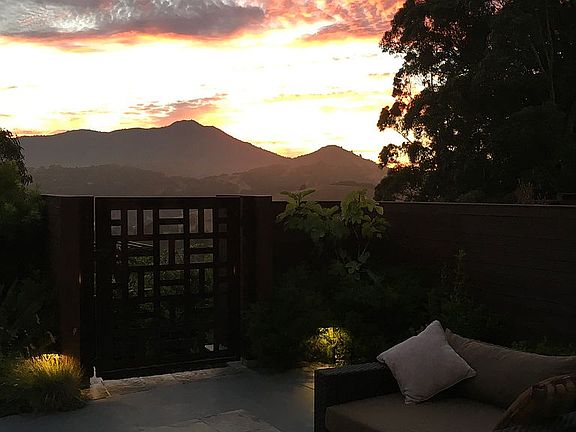 Newly renovated and expanded, this contemporary rustic home was designed with an emphasis on blurring the distinction between interior and exterior spaces through the integration of natural light, seamless indoor/outdoor flow and artistically framed views of nature. Entering through the gated courtyard garden, the front door opens to a grand foyer flowing into the large dining room and the huge great room with vaulted ceilings. The great room is anchored by a floor to ceiling reclaimed oak barn wood fireplace and chef's kitchen, large center island, and breakfast nook with custom built in banquette seating. Great room glass wall opens to the front courtyard garden which features a gas firepit and spectacular Mt. Tam sunset views to the west. Both the breakfast nook off the kitchen and the dining room open to a second rear courtyard garden patio and deck with gas grill, built in seating and south facing views of Sausalito, Richardson Bay and the evening fog flowing over and through the Marin Headlands. A staircase off this rear courtyard leads to a gazebo covered spa area with 180 degree Tam views. All bedrooms are south facing with sliding doors opening to private decks. Location is very commute friendly (just 6 mins to the Golden Gate Bridge) while being extraordinarily private and peaceful. Situated on a cul de sac that backs on to Tiburon Ridge and Ring Mountain open space preserves with miles of hiking trails that feature spectacular SF city and bay views. Close to Mill Valley village (7 min), downtown Tiburon (7 min), local shopping/restaurants (3 min) and schools (5 min). The property is completely fenced and gated for privacy and security. Additionally, plans are in process to add 900 square feet of living space.