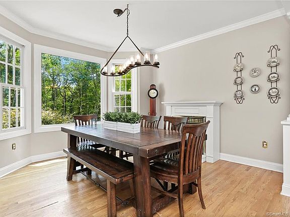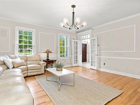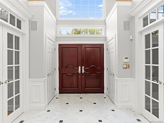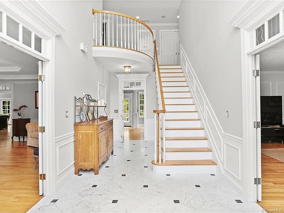 Live in the natural purity of Easton at this Connecticut retreat in Fairfield County. This stately Georgian Colonial is situated on over 3 acres of countryside tranquility and provides over 6,300 sq ft of indoor living space on 4 finished levels. The grand 2-story foyer with Carrera marble floors draws you into the home and leads to a spacious kitchen built for entertaining. The kitchen opens to dining area with large farmhouse table and deck access. A huge stone fireplace with pellet stove anchors vaulted family room connecting to quiet study with built-ins and coffered ceiling. The Music Room and Living Room provide more spaces to gather together or find privacy. The first floor is completed with hardwood floors, extensive millwork, French Doors, first floor laundry room and 2 powder rooms. The second floor has luxurious master suite with sitting area and vaulted ceilings. Three additional spacious bedrooms and 3 full baths complete this floor. The third floor serves as 5th bedroom suite with skylight and private bath. Walkout lower level is finished with den, game room, exercise room, powder room and storage. Step out the back door to explore woodlands and stunning vistas. Cul de Sac. Electric Fencing. Room for pool and spa. Create memories and enjoy the relaxed lifestyle of Easton in this New England country home.