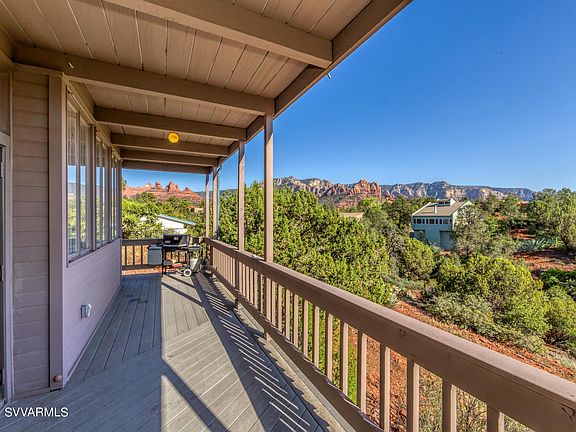 This hilltop home with unblockable 180 views is tucked away in one of Uptown Sedona's most established neighborhoods. An inviting hot tub and flagstone firepit area anchor one end of a multi-level patio and wooden deck spanning the length of the home, with red rock views from Snoopy Rock to Courthouse Butte. The main bedroom has a full bath with skylight and sliding doors to the deck. In the living room, vaulted ceilings let in tons of natural light and is further warmed by wood floors and a fireplace. On the opposite side, two additional bedrooms share another full bath with walk-in shower. With NO HOA, this hilltop hideaway will go fast.
