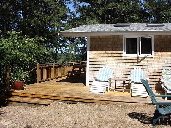 Open House Saturday the 22 from 1-3! Located on a hilltop and with a spectacular view over the extensive Fox Island Marsh, this quiet three bedroom cottage is in great condition: 9 large new skylights, a new roof, freshly painted trim, new decking in the wraparound decks and outdoor shower, and the whole house recently power washed. Just outside the front door are beautiful walking trails along the marsh, and there's a wonderful variety of birds and other wildlife, including turkeys who parade through the back yard. The house is surrounded by tall pines, and the location is very quiet, completely out of earshot of Highway 6. It's a ten minute walk down a country lane to Burton Baker Beach, a choice, secluded bay beach that is perfect for families. The cottage has an excellent rental history: $1,700-1,900 per week. Located on a acre of land with four other cottages, the condo association has very low fees to help with common expenses, including cable and landscaping. The cottage is move in ready, and can be negotiated to be sold turnkey.