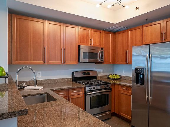 PORT LIBERTE -FOR RENT - Beautiful and sunny home with large living/diningarea with gleaming wood floors and plenty of windows for a bright and airy feel. Gourmet style kitchen with granite counters and breakfast bar, stainless steel GE Profile appliances, cherry cabinets and gas cooking! Open concept social area with French door leading to private balcony. Large bedroom with walk-in closet. Luxurious limestone bath with extra deep spa like soaking tub. Bedroom is sunny and bright with its' own walk-in closet. Full size washer and dryer within the home. Rental comes with one assigned outdoor parking space, includes gas cooking and no extra fee for use of all of the luxurious amenities that Port Liberte has to offer. Pictures are from prior to tenant moving in. They include: two resort style pools, basketball courts, tennis courts and professional gym. Easy NYC commute via on site shuttle to the Grove St. PATH Station or Ferry terminal to Downtown NYC on site. Available for August 15th or Sept 1
