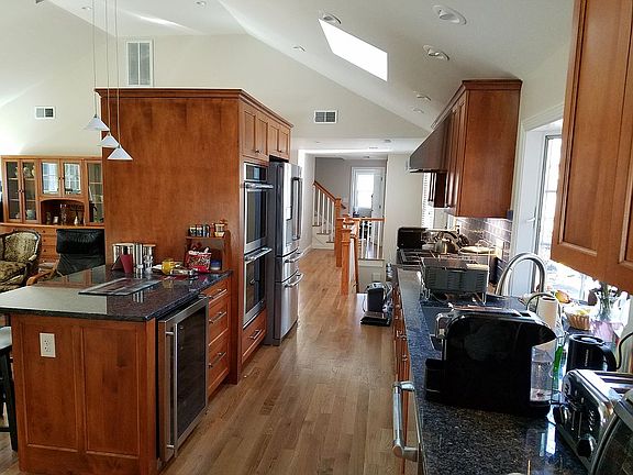 - Kit Dscrp: Flooring - Hardwood, Countertops - Stone/Granite/Solid, Skylight, Ceiling - Cathedral, Breakfast Bar / Nook, Stainless Steel Appliances, French Doors, Open Floor Plan, Recessed Lighting, Window(s) - Bay/Bow/Box, Exterior Access, Wine Chiller, Gas Stove, Peninsula, Lighting - Pendant