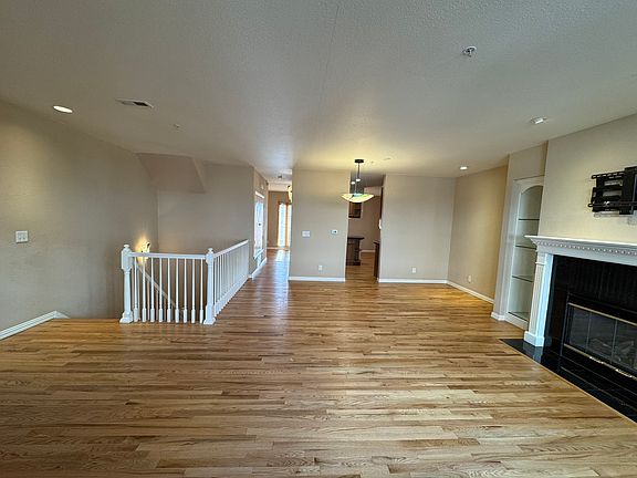 The open-concept layout features gleaming hardwood floors, modern lighting, and a cozy gas fireplace with elegant stone surround perfect for relaxing evenings. The sleek kitchen boasts granite countertops, a spacious island ideal for morning coffee, and black / stainless steel appliances.