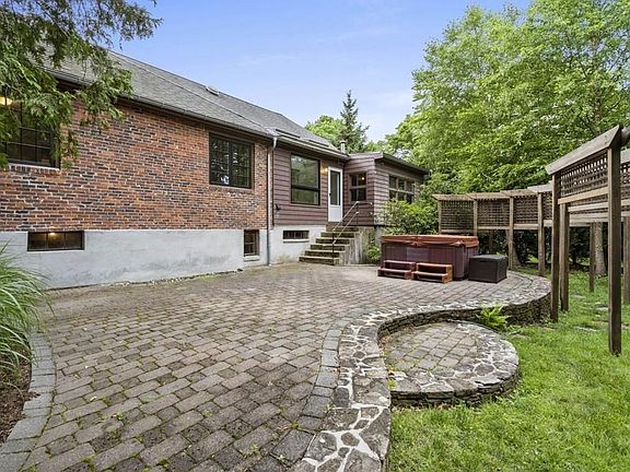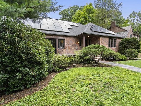 Private oasis in coveted Ward School district. Charming three-bedroom ranch with tremendous potential for expansion. The beautiful, step-down living room boasts a cathedral ceiling, exposed beams, fireplace and French Doors opening to a flagstone Piazza. The Dining Room has built-in corner cabinets and wainscoting with French doors leading to a wood paneled den with flagstone floor and beautiful outdoor views on three sides. Comfortable, eat-in kitchen with separate laundry/mudroom and plenty of storage. Three bedrooms with two full baths. Lower level with stone fireplace and playroom/gym, half bath and access to 2 car-garage with extra storage room. Expansive, insulated walk-up insulated attic could be converted to a full size second floor. Professionally landscaped backyard with mature plantings, irrigation and outdoor spas. Solar roof panels provide low cost energy efficiency.