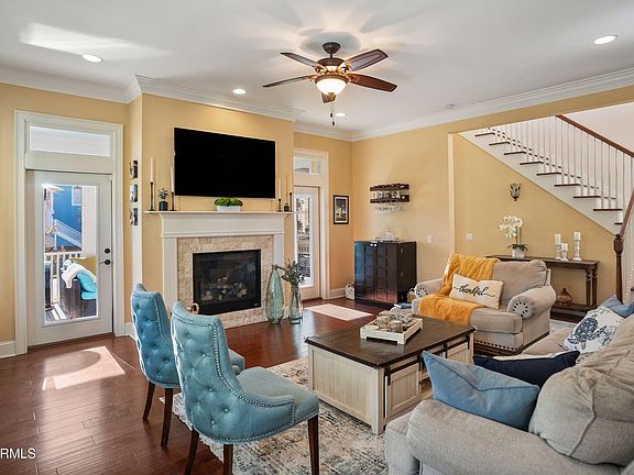 The home boasts an inviting open floor plan with custom details throughout, including hardwood floors, crown molding, windows that fill the space with natural light. The spacious kitchen is a centerpiece, featuring high-end appliances, granite countertops, and a large island perfect for entertaining.