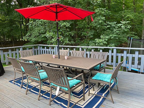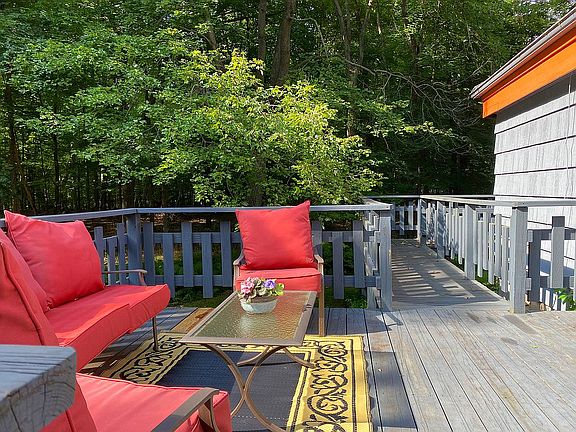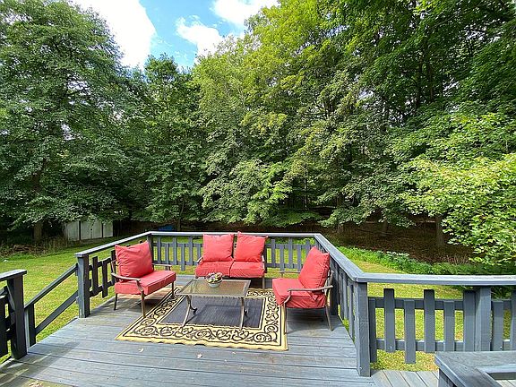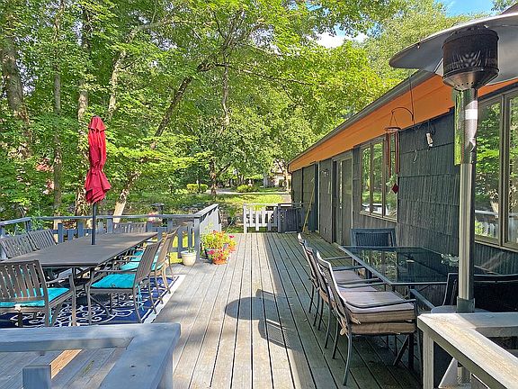 This 2,628 Sq ft, 4 bedroom home features walls of glass, wood, multiple skylights and a modernist appeal throughout. Sizable bright and white kitchen with stainless steel appliances, chopping-block ctrs & center island, and gleaming wood floors seamlessly throughout the vast U-shaped open floor plan. LR with brick fire place and glass sliders to wrap around deck. A nature-lovers back yard. Bright and spacious open family room, open DR and 2 1/2 neutral bathrooms.Plenty of closets, Central air, whirl pool tub, and so much more situated in a lovely neighborhood near the Jersey border, and NYC Express Bus nrby.