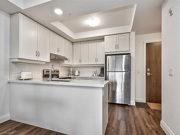 Newly built! This spectacular condo in the heart of Waterdown Village is located within walking distance to all amenities in downtown Waterdown while situated on a quiet nonarterial road. Enjoy amazing view of the Hamilton Harbour, Skyway Bridge, Lake Ontario, and more from the 6th-floor common terrace with BBQ's. This one of a kind upscale building has all the features desired in any Big City Condo while offering Small Town Charm. Features of this bright and spacious 1 bdrm unit include a den, all upgraded flooring throughout, all stainless steel appliances, under cabinet valence (ready for lighting), Quartz counters with upgraded backsplash and build out above the fridge and upgraded undermount sink. In-suite washer and dryer, upgraded bathroom and more! Handy storage locker on the same floor (#209). Underground parking (P1#4) and Concierge service. 5-star lobby, dog wash station, bike storage, electric vehicle charging, full size work out area, and more.