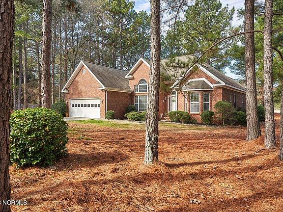 GOLF FRONT! One level, all-brick home situated on the #3 hole of the Pines Course @ Whispering Pines Country Club. Wonderful curb appeal and positioned back off the road, providing privacy and lovely long range views. Conveniently located just steps from the new Whispering Pines park (under construction), which is due to feature a walking trail, tennis courts, picnic pavilion and many other recreational activities for village residents. There are many wonderful features in this beautiful home to include 14ft ceilings, a large Palladian window that fills the living area with natural light, a split bedroom floor plan, a spacious office with bay window and a gorgeous sunroom and deck perfectly positioned to maximize the golf views.