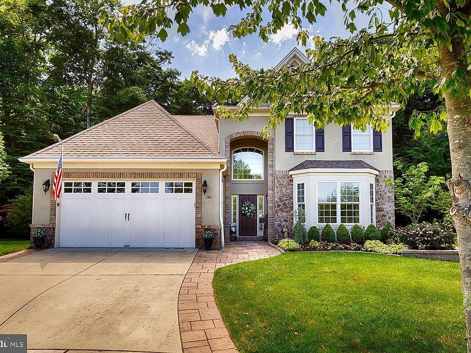 This magnificent home at 30 Harlow Circle, Medford, NJ, offers premier 55+ living in Wyngate at Medford. Nestled in a private cul-de-sac, this Dunham II style home features European exterior styling, impressive landscaping, and a paver walkway leading to an arched portico entrance. The 2-story interior boasts fine craftsmanship with a 2-story foyer, expanded gathering room, wainscoting, tray ceilings, and bay windows in the living, dining, breakfast, and primary bedroom. The gourmet kitchen includes a Viking gas range, Bosch wall oven, quartz countertops, a breakfast bar, and a butler area with a wine refrigerator. The grand gathering room has a soaring ceiling and a gas fireplace, opening to a breakfast room and a sunroom with hardwood floors and cathedral ceilings. The primary bedroom on the first floor features a bay window sitting area, his and hers closets, and a spa-style bath with a frameless shower and granite double sinks. The first-floor laundry room has built-in cabinetry and a utility sink. Upstairs, find a wide loft, 2 additional bedrooms, a full bath, and storage rooms. The two-car garage includes additional storage and a 2nd refrigerator. New features include backyard hardscaping with extensive landscape lighting (Front & Rear), an outdoor fireplace with an entertainment wall, a gated rear patio, new hardscaping in the front walkway, freshly painted throughout, new quartz countertops, a new GE fridge, and all-new Hunter Douglas window treatments. No contingencies.