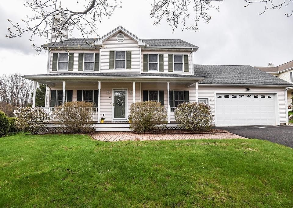 Stunning & stylish! This picture perfect colonial has an open floor plan with hardwood and tile flooring throughout. Beautifully updated kitchen with quartz counter tops and white cabinetry, kitchen island, stainless appliances & tile accent. Living room with fireplace & dining room opens to a lovely screened porch where you will enjoy many an evening. There is also a first floor den or study to get away from it all. Delight in the fantastic Master suite with window seat and large walk-in closet. Central air, 3 year old roof and a newer natural gas, hybrid heating system. The bathrooms have been recently updated with new vanities, new lighting and fresh paint. Cul-de-sac location with finished space in the basement and over-sized garage with 8 foot doors, patio and shed. This is the one you've been waiting for! First showing at the Open House Sunday 5/5, 12-2!