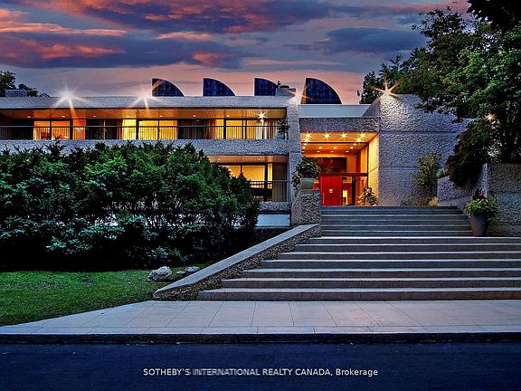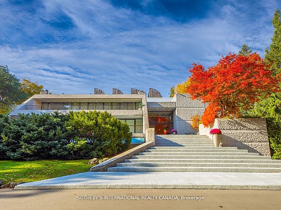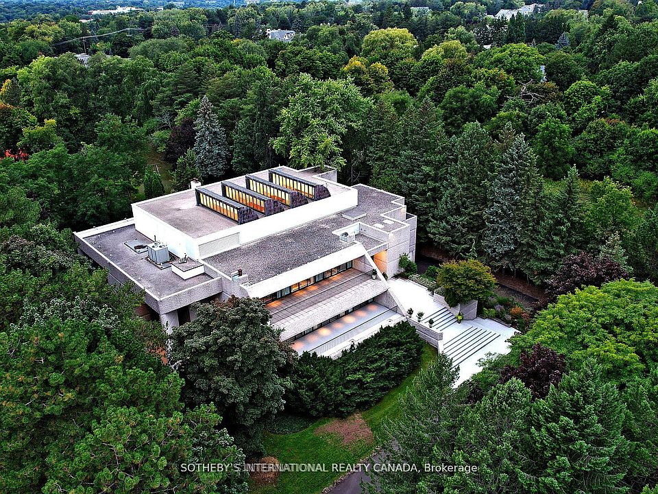 An exceptionally rare landmark residence in Toronto's most prestigious neighbourhood. Discreetly hidden behind lush landscaping & on the quietest section of the Bridle Path. The internationally renowned architect John C Parkin successfully implemented his modern vision into this mid-century masterpiece. Parkin's forward thinking brought to life these unique attributes:(1) integrated a beautiful concrete building into the 2.12-acre landscape, with less traffic & more privacy (2) flooded the spaces in natural sunlight thanks to the central 4-storey solarium with massive skylights & enormous windows & private indoor & outdoor pools (3) subtlety united 2 ground-level drive-through indoor-garage facilities, and additional surface parking lot through circular driveway direct to grand landing. (4) created opulent spaces & casual intimate areas. Host a sizeable charitable event, with 26,000 sqft of space across all levels plus enormous open space at 3.5 storey atrium, you can easily accommodate large gatherings. Have a live band at the base of the atrium or spend intimate time in the zen meditation garden **EXTRAS** You will appreciate meticulous plans at every aspect of this modern wellness design. A statement for your family name stamp. A phenomenal estate to add to your life's most valuable collections.