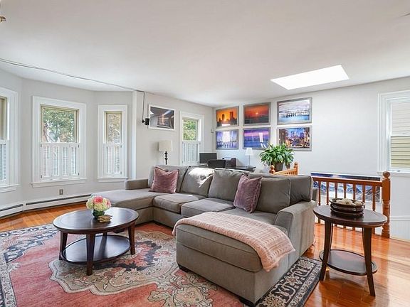 Perched atop High Street, this sunny 2+BR/1.5BA penthouse is located next to Monument Square and offers nearly 1,100sf of living space and a stunning private roof deck with spectacular views of the Zakim Bridge and Boston skyline. An enormous bow front living room with soaring ceilings, built-in bookshelves, four windows, and a large skylight opens to a dining space and a well-appointed kitchen with cherry cabinetry, stainless appliances, granite countertops, and a peninsula with bar seating. A half bath with pedestal sink is tucked off the living space. Tucked at the rear for privacy, the master bedroom offers a walk-in closet and adjacent bonus room, perfect for an office or nursery. A spacious full bathroom with Carrara marble topped double vanity and bathtub with subway tile surround, and a generous second bedroom complete this home. Amenities include: in-unit W/D, hardwood floors throughout, and basement storage.