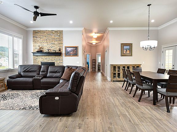 Features include gourmet kitchen with gas double oven, marble counter tops, nice size island, new cabinets, luxury vinyl floors, and all stainless steel appliances are included. 12' high ceilings, crown molding, gas fireplace, separate office/den, new interior and exterior paint, new roof. Covered outdoor living area with outdoor fireplace, great for entertaining. RV parking. Large finished shop 18x22 with heat. Too many details to list, must see!