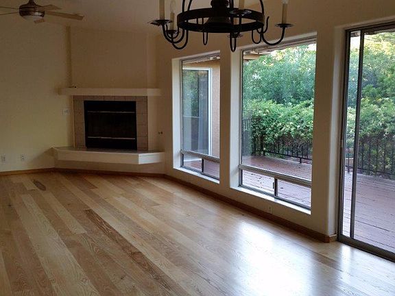 Beautiful views of Thunder Mountain from floor to ceiling windows beyond the garden-like backyard. Fruit trees, wood deck, stone walking path, spa, and colorful flowers surround a flowing water feature and fish pond. Split floor plan with an open, light, and multi-windowed master bedroom and newly remodeled bath. Beautiful hardwood floors throughout with carpeted bedrooms. Living/family room has corner fireplace and floor to ceiling windows. Large kitchen with a cute breakfast nook has stainless steel appliances including a Viking Dual Fuel range. There are also hardwood cabinets, a center island, and granite countertops. If you like to cook, you will love this kitchen! There is lots of storage throughout the home. The second bedroom has a large bay window, large closet, & direct bathroom