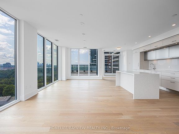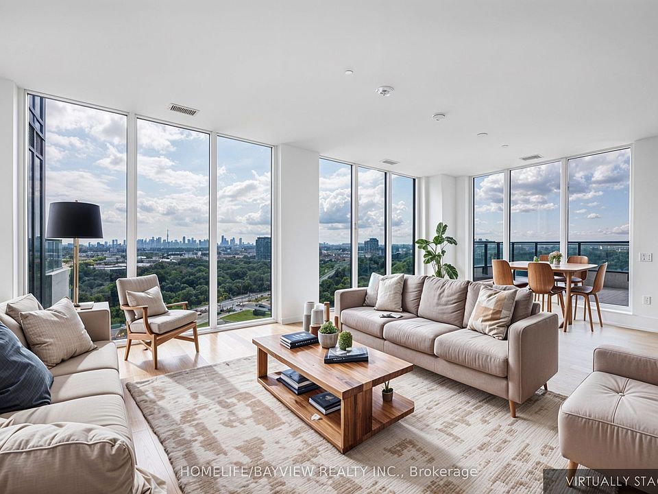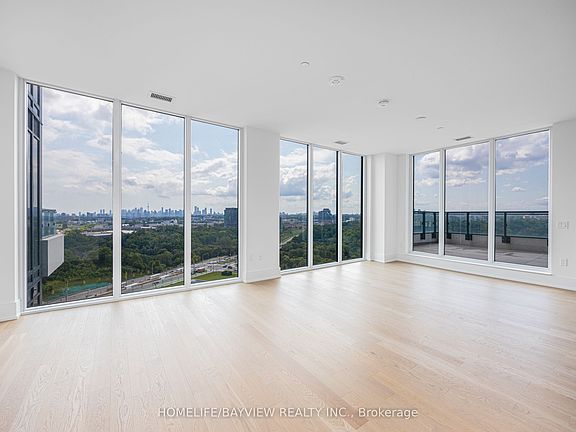Welcome to the elegant Auberge on the Park, a Gold LEED Certified community by award-winning TRIDEL, perfectly located at Leslie & Eglinton and surrounded by lush parklands. This stunning 3-bedroom, 3-bathroom executive residence offers 1,740 sq ft of luxurious interior living space, two parking spots, one locker, and an impressive terrace ideal for morning coffee or sunsets overlooking Sunnybrook & Wilket Creek Park. A sun-filled corner suite with wall-to-wall, floor-to-ceiling windows, enjoy breathtaking South-West facing panoramic views of the Toronto skyline and greenery. The open-concept living, dining, and kitchen areas are perfect for entertaining, featuring engineered hardwood floors and a chef's kitchen with Miele appliances, quartz counters, a waterfall island, custom backsplash, and ample cabinetry. The primary suite offers two walk-in closets and a spa-inspired ensuite with glass-enclosed shower. The second bedroom includes its own ensuite with bathtub, while the third bedroom-also with a closet-functions beautifully as a guest room or home office. A separate laundry room with storage adds everyday convenience. Enjoy resort-style amenities: 24-hour concierge, visitor parking, state-of-the-art fitness centre, spin & yoga studios, outdoor pool, whirlpool spa, cabanas with BBQs, terrace dining, party & private dining rooms, theatre, rooftop gardens, and more. Unbeatable location-steps to Sunnybrook Hospital, Sunnybrook Park, Wilket Creek Park, E.T. Seton Park trails, and minutes to Toronto Botanical Gardens, Shops at Don Mills, restaurants, supermarkets, big box stores, Leaside, and the upcoming Eglinton LRT. A rare offering for those who value comfort, convenience, and luxury. Available December 1st.