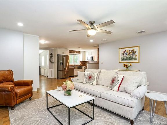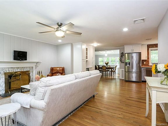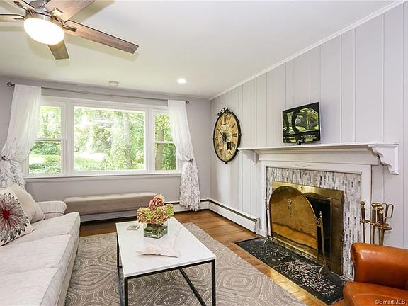 Stylish and updated home in the heart of Ridgefield and situated privately at the end of a cul de sac neighborhood. A prime location to all things Ridgefield! First floor open concept boasts a compact chefs kitchen with kitchen aid stainless steel appliances, farm sink, gas stove, white cabinetry, quartz counter tops and other modern touches with a perfect and well designed matching pantry/wine cooler/bar area. The open Kitchen to living room allows for ease of entertaining and relaxing in the living room with wood burning fireplace and dining area with wall of cottage windows that overlooks a newly expanded backyard. 3 main level bedrooms share a gorgeous bath. Off the dining area, stairs lead to a generous lower level family room with a beautifully renovated shower bath and walk out to backyard. A bonus storage area is 240 sq ft with it's own exterior access and newly located laundry. New oil tank,new central a/c, new 200 amp service, and delightfully remodeled interior features add to the overall comfort of in town living. A great place to call home.