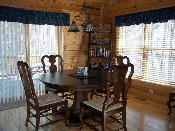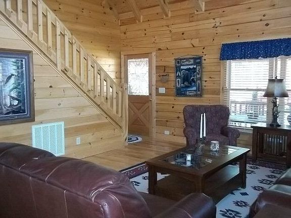Located in the Hidden Lake log home community, this 2BR/2BA home is being sold fully furnished! Great as an investment property, or vacation home. The main floor features hardwood flooring in the living and kitchen areas. A large island is the focal point of the kitchen, but there is also an additional dining area. Larger walk-in shower is in the bathroom, along with single vanity sink, and tile flooring. The guest bedroom is on this level and is carpeted. Washer and dryer go with the home, and are on this level as well. Upstairs features a large loft area, large master bedroom, walk-in closet, and bath with tiled walk-in shower. Loft and bedroom are carpeted. Custom doors throughout home, along with electric fireplace in living room and many extras. Bring your personal items and move right it! Seller is motivated!