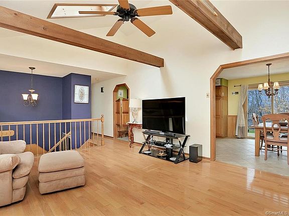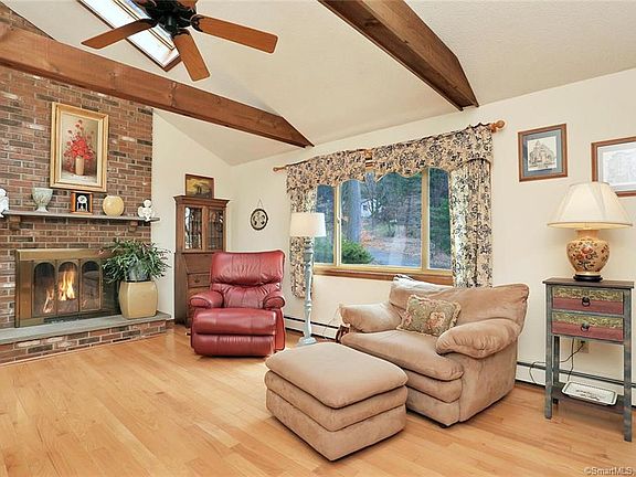 Desirable Hilltop Location! Tucked away at the end of the cul-de-sac on private 1.84 acres, this impeccably maintained Raised Ranch will steal your heart. The main level boasts an open floorplan featuring a sunfilled Living Room w/ vaulted ceiling, exposed beams, 2 skylights and woodburning fireplace plus a large, EIK/Dining Area which has oak cabs, granite countertops & sliders to the backyard. The Master Ste. enjoys a newly remodeled full Bath. The finished lower level offers a spacious Family Room w/ 2nd fireplace, newer flooring & separate Laundry Room. Additional special features of this home include; most windows replaced, newer furnace (approx. 3 yrs), updated all light fixtures, installed new deck (Fall/'17), painted exterior (Summer/'17), added gutter guards and replaced front storm door. Hardwood Floors. Oil Tank in 2 Car Garage. Enjoy beautiful sunsets while relaxing on your deck. You'll be glad to call this one home!!