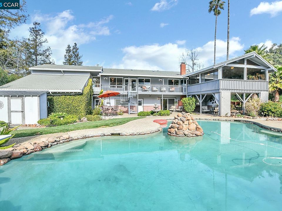 SEMI-CUSTOM ESTATE situated on half acre in the serene Kirkwood Ct neighborhood. This dream estate boasts a gourmet kitchen, breakfast nook, formal dining room, 2 ensuites, 2 spacious bedrooms, 3 bathrooms, sprawling formal living and 2 family rooms, office/den, bonus sunroom and an absolutely dreamy indoor-outdoor layout for entertaining. Resort-like amenities with panoramic VIEWS of Mt. Diablo and beyond, including pool, diving board and water fountain. Private backyard features lush landscaping, stone retaining wall, spacious resort style cabana, fire pit patio, upper and lower decks, coy ponds, sweeping hillside and your very own fruit orchard. Expansive driveway for ample parking and spacious 4-car garage. French doors from the main living areas open up to the upper viewing deck boasting breath-taking views of Mt. Diablo and the park-like backyard oasis. Downstairs space features the second ensuite, dining nook, second family room and laundry room with sink and custom storage. This space is perfect for guests or can be used as an in-law unit. Wait, there’s more! Attached ADU features a one bedroom with its own private entrance, full-sized kitchen w/granite counters, and abundant storage. Large bath/laundry combo. YOUR DREAM HOME AWAITS!