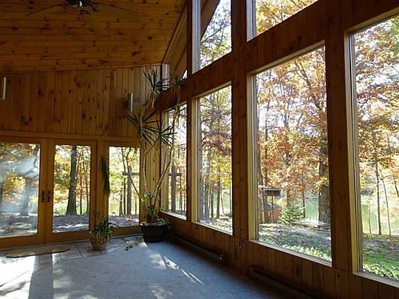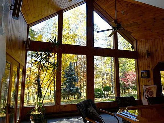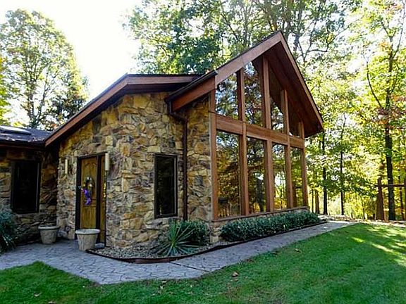 Private drive leads to picturesque setting of sprawling stone ranch w/walls of windows, skylights and soaring ceiling w/breath taking views of lake and pond. Pathways meander between water's edge, 2-car lakeside garage, picnic pavilion, storage sheds, 2-car detached garage near home plus integral garage. Sliders to large patio-Living Room / Family Room combine large stone fireplace & wet bar with open concept of dining room and kitchen all to enjoy pure beauty of nature.Master BR 14x9 dressing room/den. Home 2,890 square feet. UPON approach to private lane - the second parcel (5.6 acres) consists of 24x34 frame office building, 12x34 covered storage area, concrete block foundation for future home and 2-car detached garage 25x25 at entrance just off Lanik. Public water is available and would need to connect to a future home upon this block foundation. The home is beyond the brick pillars.