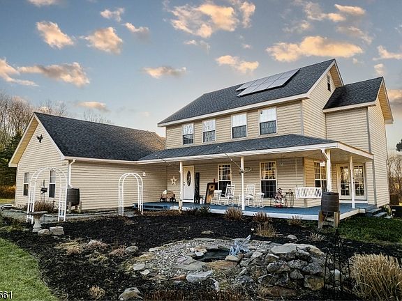 Welcome to your private retreat on 3.5 serene acres, just minutes from Route 80! This beautifully maintained 4-bedroom, 2.5-bath Colonial offers the perfect blend of modern upgrades and classic charm. An inviting front porch leads into a bright and open floor plan featuring spacious living areas, a wood-burning fireplace, and wide-plank flooring throughout. The heart of the home is the upgraded kitchen, showcasing stone countertops, white cabinetry, a center island, and a seamless flow into the dining area- ideal for entertaining or gatherings. Upstairs, you'll find four generous bedrooms including a tranquil primary suite with an ensuite bath. Each room is filled with natural light and offers peaceful views of the surrounding property. The home's thoughtful updates include energy-efficient solar panels, new flooring, and fresh neutral finishes that complement any style. Step outside and experience your own backyard paradise. Complete with a custom deck, hot tub, whole house generator, and a saltwater inground pool surrounded by beautiful open space and privacy. Whether hosting summer barbecues or enjoying quiet mornings on the porch, this property offers year-round comfort and relaxation. With a convenient location just minutes from Route 80, this home combines country living with easy access to shopping, dining, and commuting routes. Don't miss this incredible opportunity to own a move-in-ready home that truly has it all. Space, style, and seclusion!