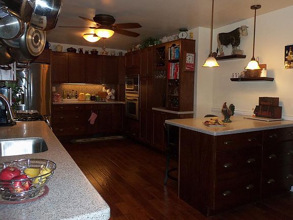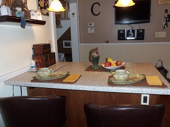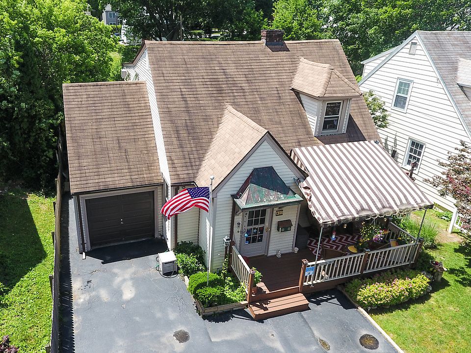 Deceiving from the outside must see the inside. Updated kitchen, custom cabinets, corian countertops, double wall oven, gas stove, hardwood floors. Bright dining room. Gas fireplace in living room. Level backyard with double decks above ground pool two years old. Front porch with awning. Alarm system. New oil burner, new oil tank. Updated Electric.